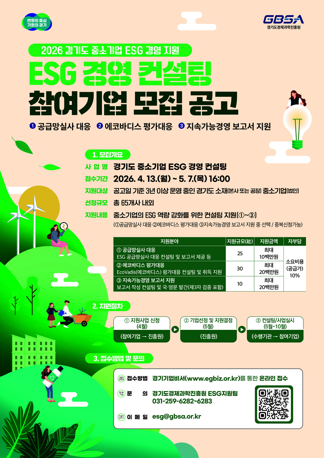 경기도경제과학진흥원은 다음 달 7일까지 '경기도 중소기업 ESG 경영 컨설팅 지원사업'에 참여할 기업을 모집한다고 15일 밝혔다.