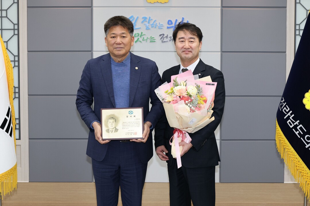 | ▲ 신의준 전남도의원(완도 2·더불어민주당)이 지난해 2월 5일 수협중앙회로부터 감사패를 수여받은 뒤 기념 촬영을 하고 있다. [전남도의회 제공] |