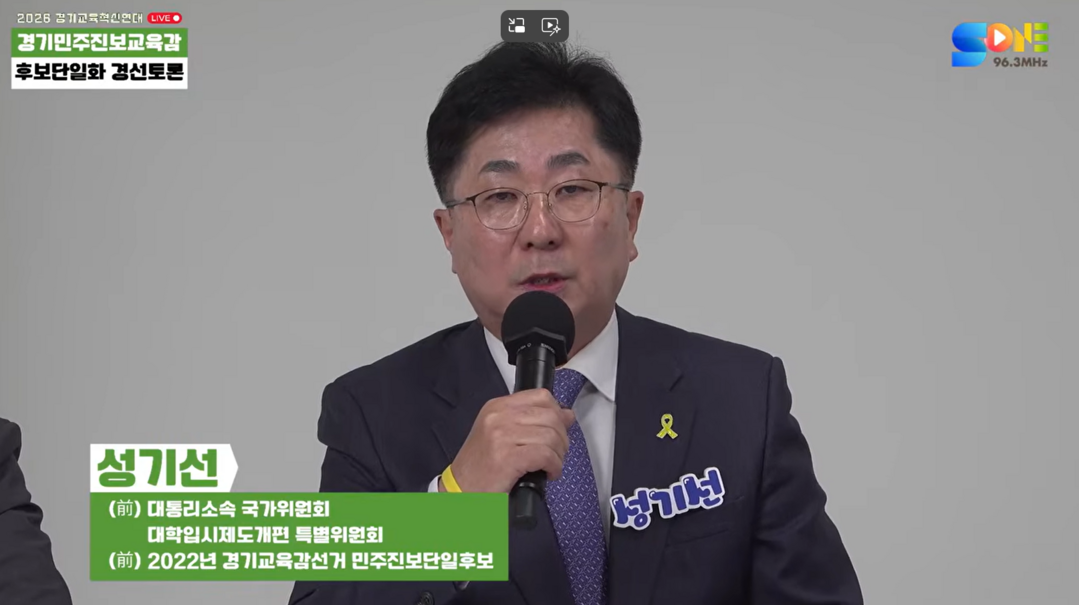 성기선 후보는 "지금 경기도는 도농 간의 격차, 구도심과 신도심 간의 격차 뿐만 아니라 계층 간 격차 등 불평등 구조가 집중돼 있다. 이 격차는 개인의 문제가 아니라 구조적 문제다. 고등학교 평준화도 대단히 심각한 어떤 문제 중 하나"라고 진단했다.