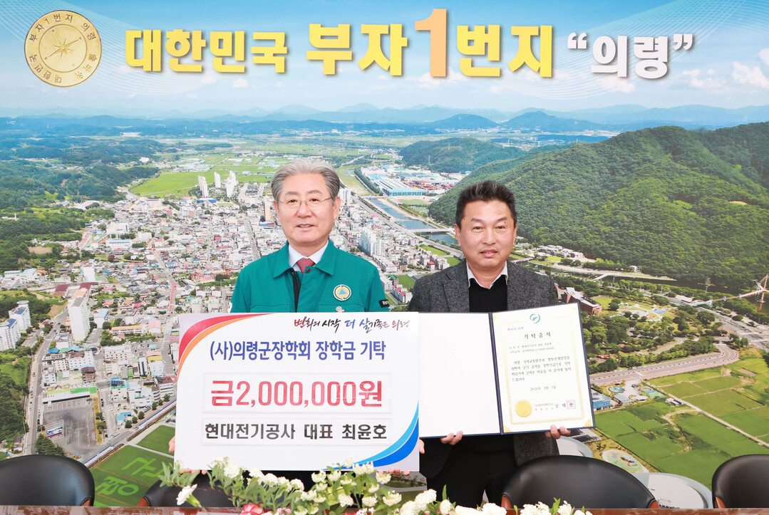 경남 의령군 의령읍 소재 현대전기공사(대표 최윤호)는 지난 7일 군청에 장학금 200만 원을 기탁했다.