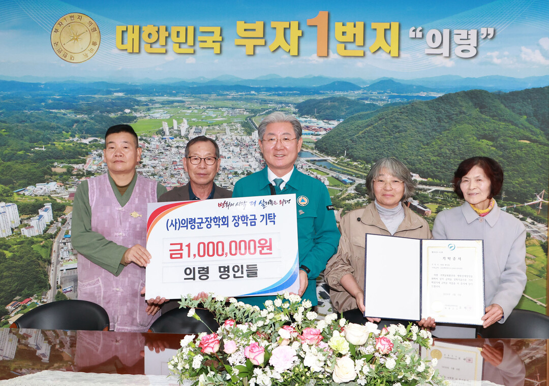 지난 6일 의령군에 주소를 두고 각 분야에서 활발한 활동을 이어오고 있는 명인들이 의령군장학회에 장학금 100만 원을 기탁했다.
