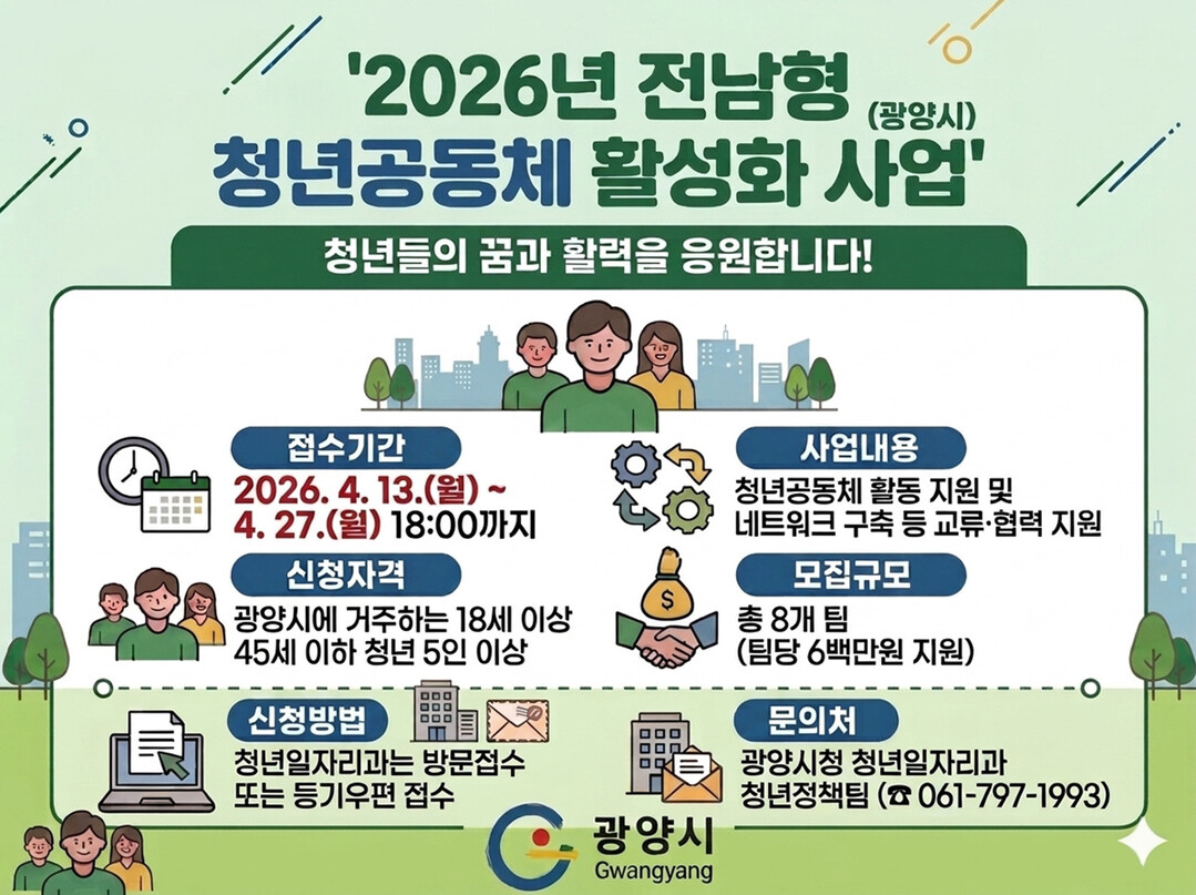 광양시는 13일부터 오는 27일까지 '2026년 전남형 청년공동체 활성화 사업'에 참여할 청년공동체를 공개 모집한다.