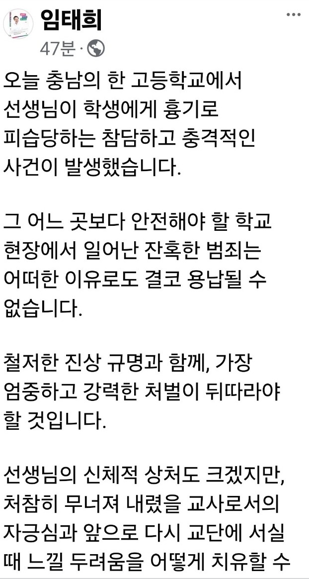 임 교육감은 이날 오후 자신의 페이스북에 올린 글에서 "오늘 충남의 한 고등학교에서 선생님이 학생에게 흉기로 피습 당하는 참담하고 충격적인 사건이 발생했다"면서 이같이 말했다.