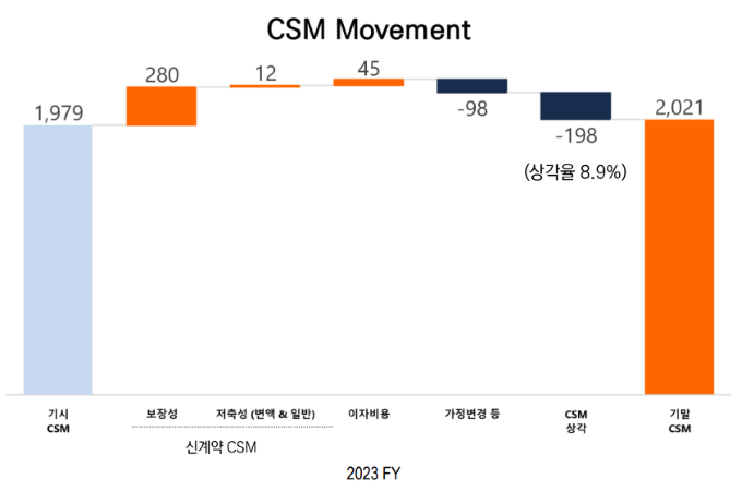 신계약 보험계약서비스마진(CSM)은 2918억 원으로 전년(2723억 원) 대비 7.2% 늘었다. 지난해 말 기준 CSM은 전년(1조9795억 원) 대비 2.1% 늘어난 2조215억 원으로 집계됐다.