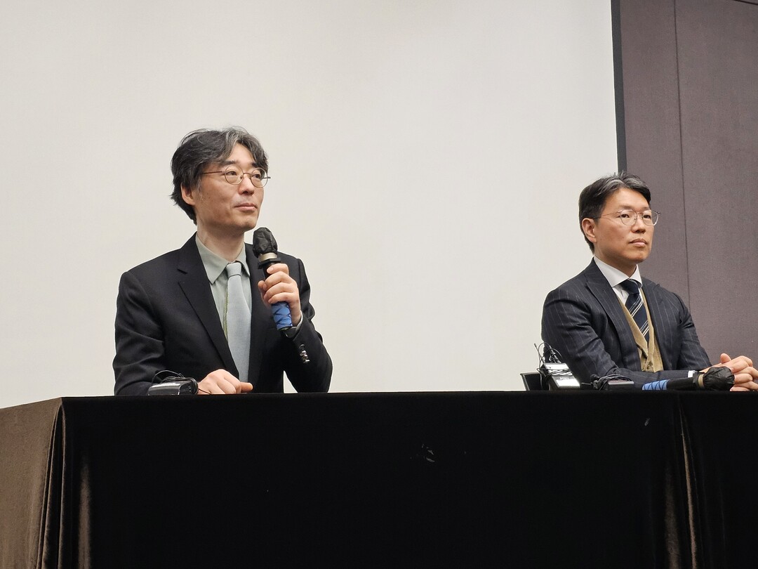 | ▲ 28일 경기도 화성시 라비돌 리조트에서 열린 한미사이언스 주주총회에서 사내 이사에 선임된 임종윤(왼쪽), 임종훈 이사가 프레스룸에서 발언하고 있다.[유태영 기자] |