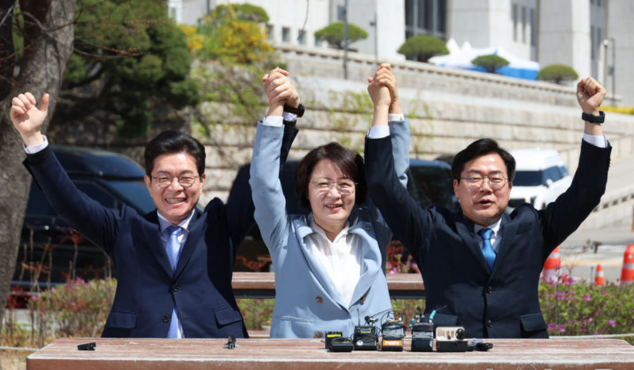 | ▲ 더불어민주당 정원오 서울시장 후보, 추미애 경기도지사 후보, 박찬대 인천시장 후보가 12일 서울 여의도 국회 소통관 앞 벤치에서 열린 수도권 광역단체장 후보 '원팀 간담회'에서 포즈를 취하며 기념촬영하고 있다. [뉴시스] |