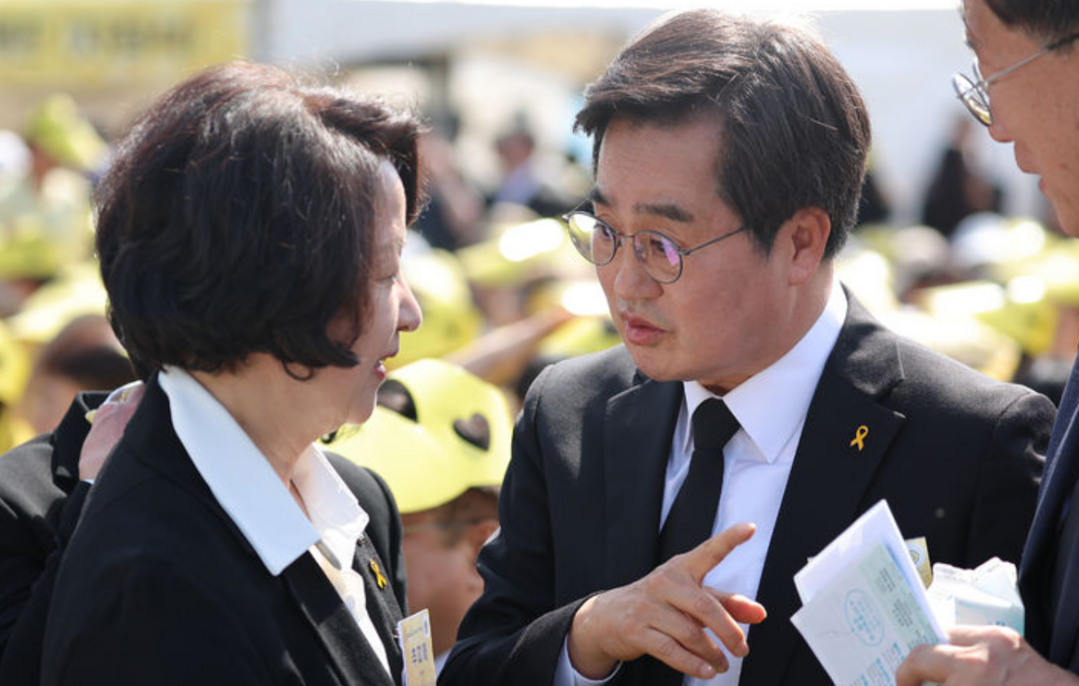 | ▲ 김동연 경기도지사와 추미애 더불어민주당 경기도지사 경선 후보가 16일 경기 안산 화랑유원지에서 열린 세월호 참사 12주기 기억식에서 대화하고 있다. [뉴시스] |