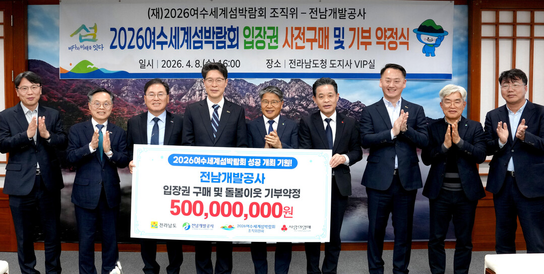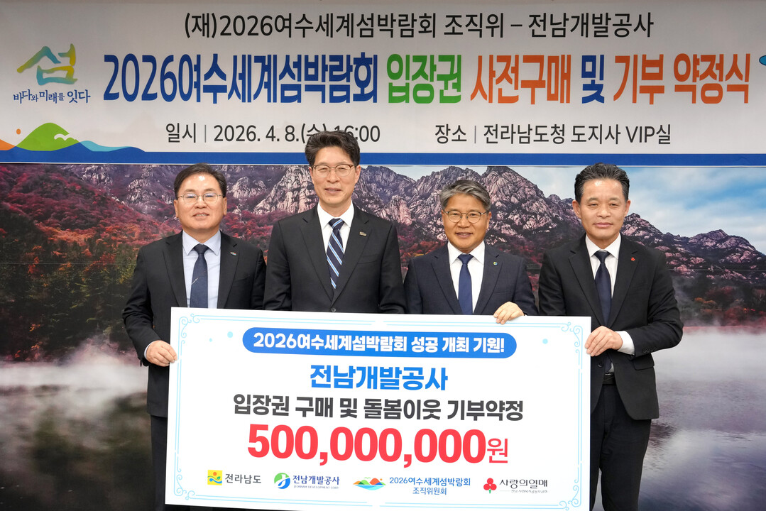 | ▲ 황기연 전라남도지사 권한대행이 8일 도청 접견실에서 장충모 전남개발공사 사장, 정현구 여수시 부시장 등과 함께 2026 여수세계섬박람회 입장권 구매와 기부약정을 체결한 뒤 기념 촬영을 하고 있다. [전남도 제공] |